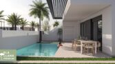 Patio 8m2. Swimming pool 11m2. The homes are finished to a high quality. Including kitchen appliances, air conditioning hot/cold with air zone, alarm, indoor and outdoor lighting, for the ground floor apartments 1m80 high walls for extra privacy and automatic gate openers, for the 1 floor apartments with outdoor kitchen and swimming pool on the roof terrace. The airports of Corvera and Alicante can be reached in about 30 and 50 minutes respectively.